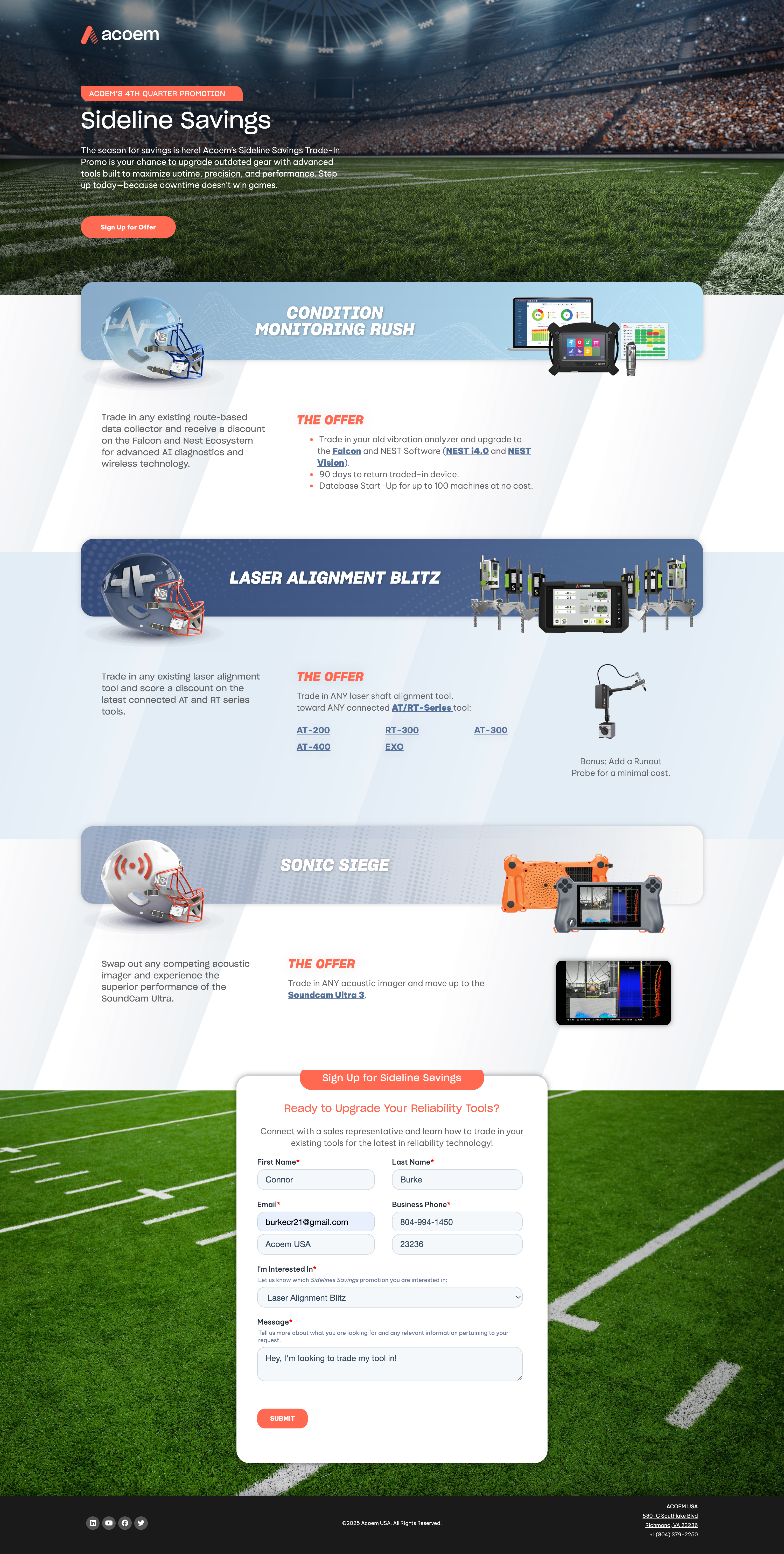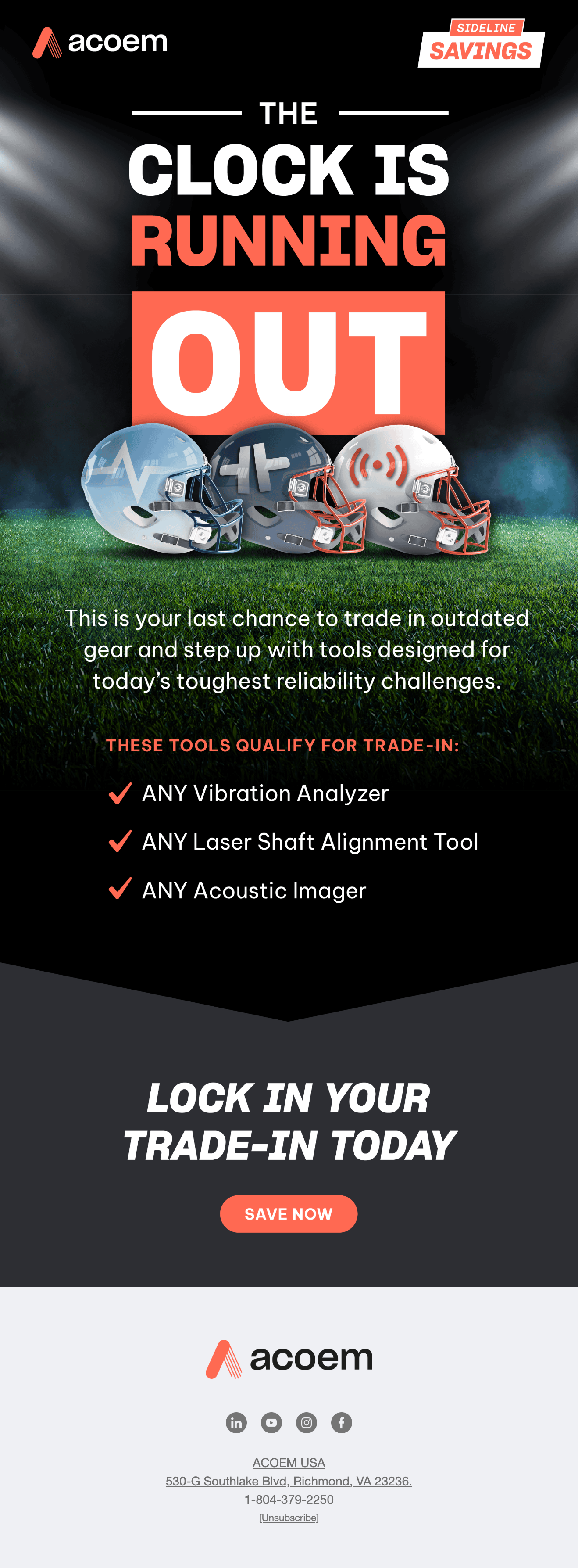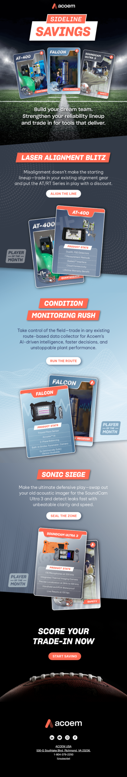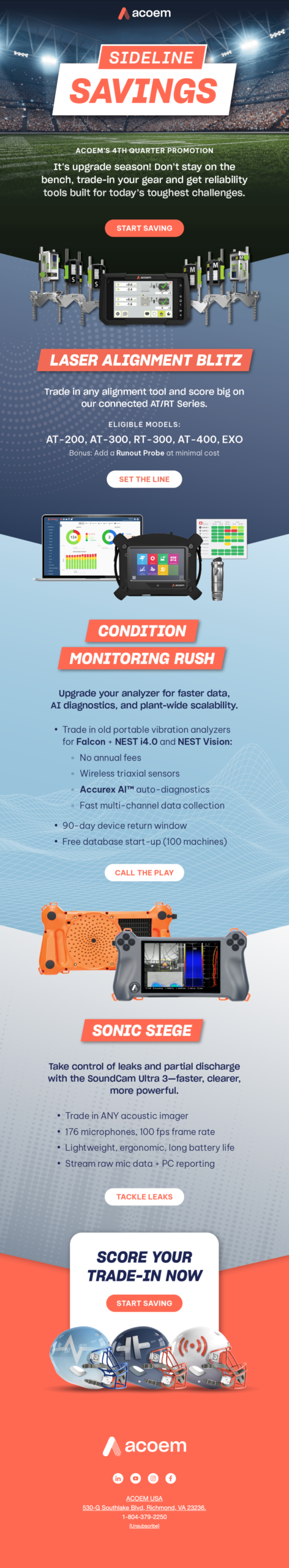 As Acoem USA approached Q4 2025, senior leadership wanted to drive incremental revenue within the portable, corrective, and predictive maintenance product line through a trade-in promotion for legacy tools. I led the creative direction and campaign strategy, transforming a straightforward discount program into a cohesive, seasonal narrative aligned with the start of the NFL season. We developed a football-themed campaign concept anchored in “kickoff” and “4th quarter” momentum, supported by custom visual assets including product trading cards to create a more playful, ownable identity.
