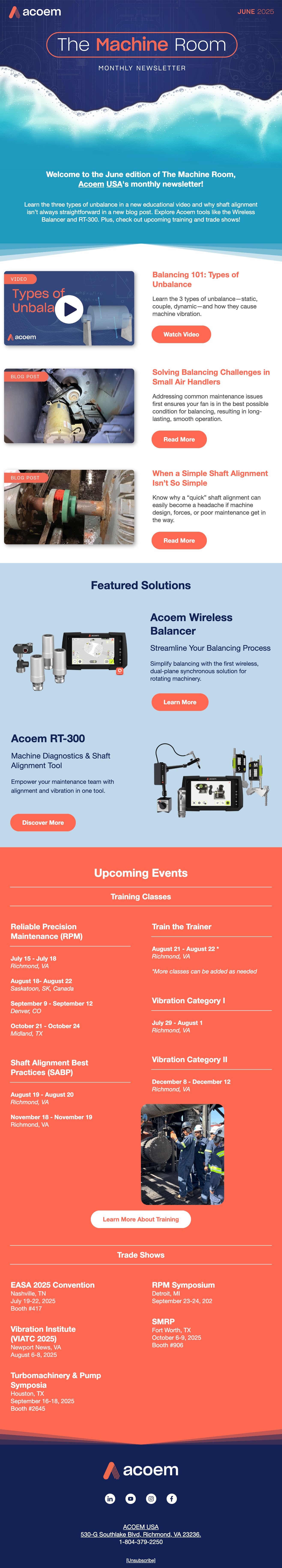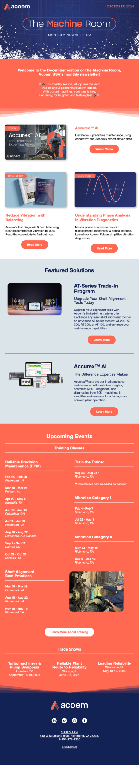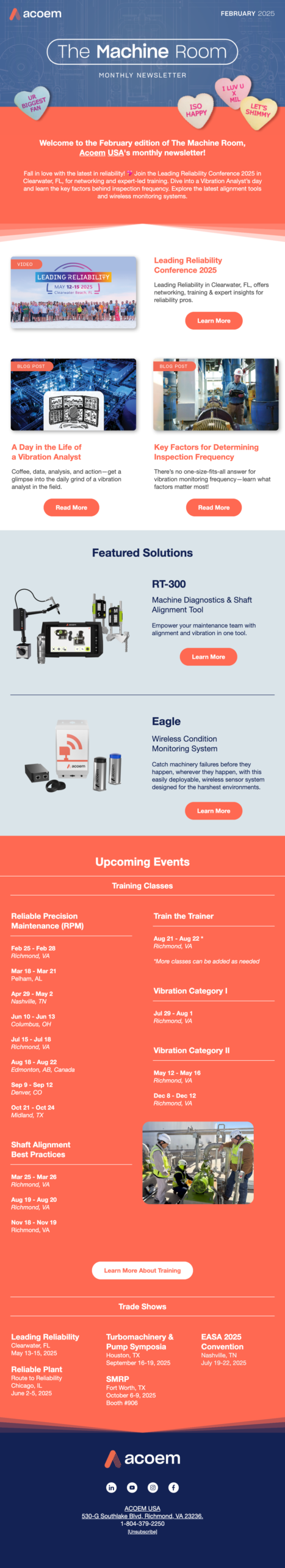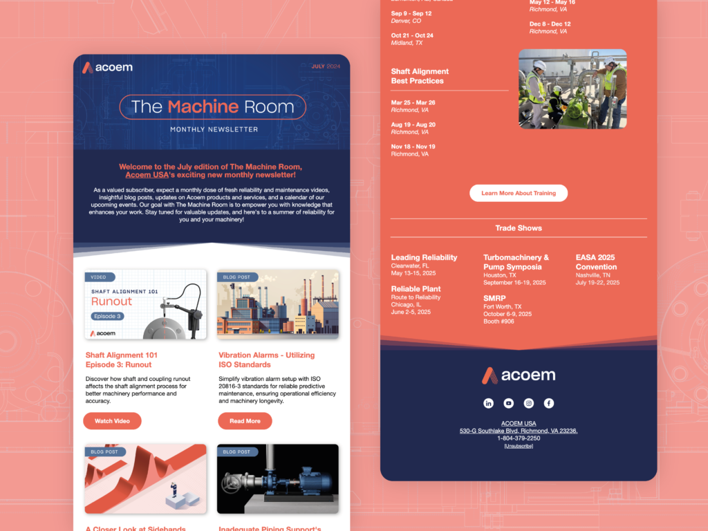 The Machine Room was created to establish a consistent monthly email cadence that moved beyond one-off blasts and built an ongoing dialogue with Acoem’s reliability audience. I led the strategy and creative direction for the newsletter as both a top-of-funnel growth channel and a brand touchpoint designed to reinforce our “Reliability Partner” positioning. Each issue curated educational content alongside product and service updates, trade show presence, and upcoming training opportunities to provide real utility rather than promotional noise. The editorial approach framed the brand as a trusted partner to the field—helpful, current, and aligned to what maintenance teams actually need.
