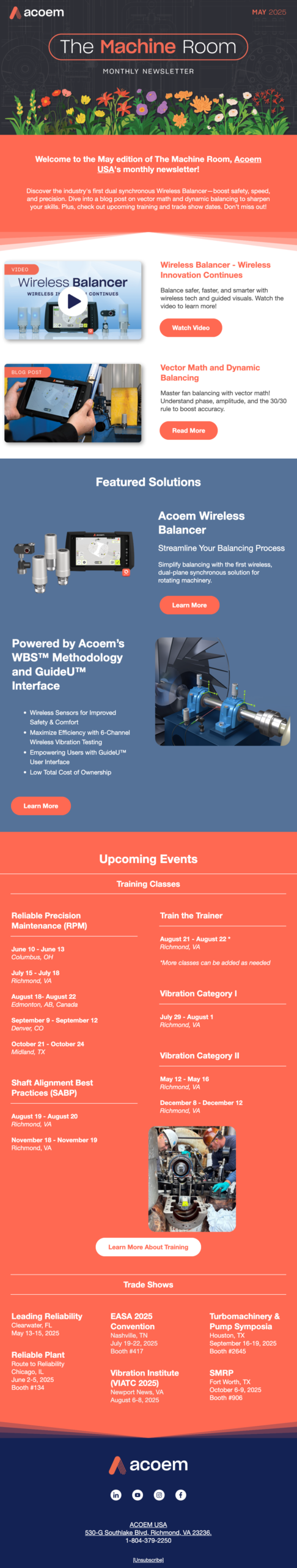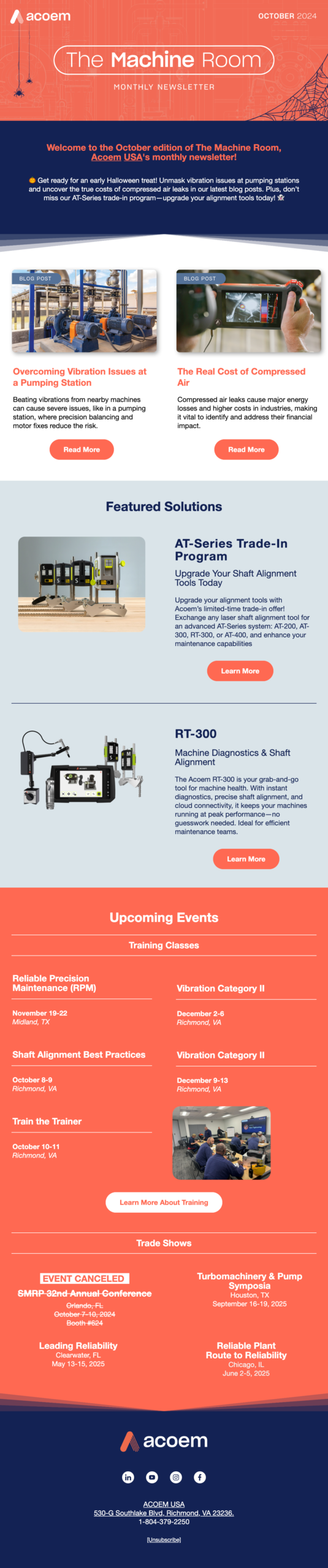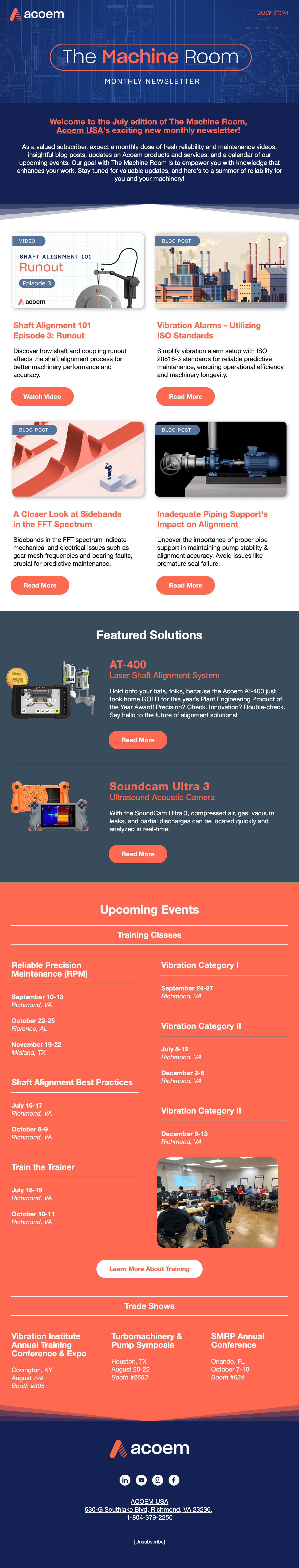 The Machine Room was created to establish a consistent monthly email cadence that moved beyond one-off blasts and built an ongoing dialogue with Acoem’s reliability audience. I led the strategy and creative direction for the newsletter as both a top-of-funnel growth channel and a brand touchpoint designed to reinforce our “Reliability Partner” positioning. Each issue curated educational content alongside product and service updates, trade show presence, and upcoming training opportunities to provide real utility rather than promotional noise. The editorial approach framed the brand as a trusted partner to the field—helpful, current, and aligned to what maintenance teams actually need.